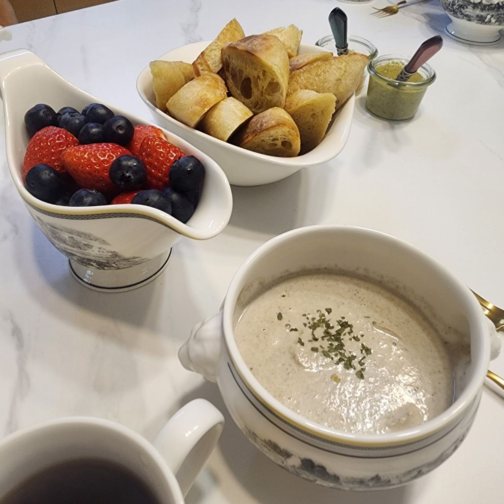 양송이스프 끓여서 바게트 구워 아침도 간단히 먹어봅니다.