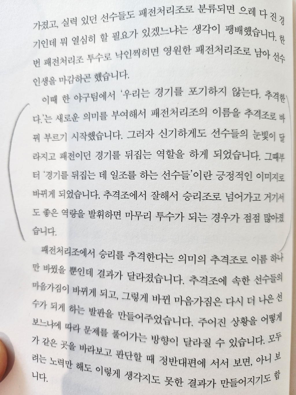 과거에는 ‘패전처리’ 라고 불렀는데, 지금은 ‘추격조’ 라고 부른다고 합니다. 멋지네요. 익숙한 장면을 ‘다르게 보고 다르게 부르기’ 만으로도 태도가 달라지네요.