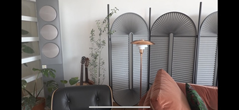 이 사진에서 볼 두가지는 룸디바이더와 플로어램프야. 룸디바이더는 비교적 최근인 2015년 Christophe de la Fontaine 이라는 디자이너가 Dante 라는 회사를 위해 디자인 한 작품인데 모던 아르데코 스타일을 추구했다고 하네. 벽이 허전해보일수 있었을텐데 저렇게 두니 소파랑도 넘 잘 어울리는거 같아
