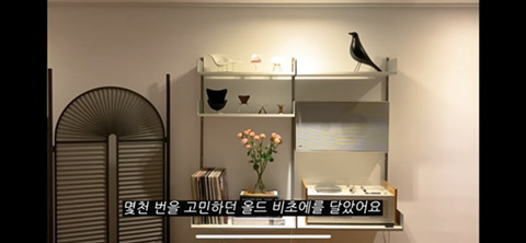 이 사진속에 보이는 쉘빙유닛은 또 너무나도 유명한 비초에 제품이야. 역시 미드센츄리 디자인, 그러니까 약 60년전에 디자인 된 제품이고 모듈형이야. 흥미로운건 비초에 웹사이트에 들어가서 본인이 원하는 벽면 사진과 치수를 적어 내면 비초에 측 디자이너가 서너가지 디자인 제안을 해줘. 사진속 모듈은 약 300만원 정도 될거 같아. 그리고 왼쪽 상단에 위치한 미니어쳐 가구들 너무 깜찍하지! 유명한 미드센츄리 의자 디자인들 미니어처인데 아르네 야콥센의 에그체어, 시리즈세븐체어, 그리고 사리넨 튤립체어 등이 보이네. 미니어처 당 가격이 20-30만원 하는거로 알고 있어.
