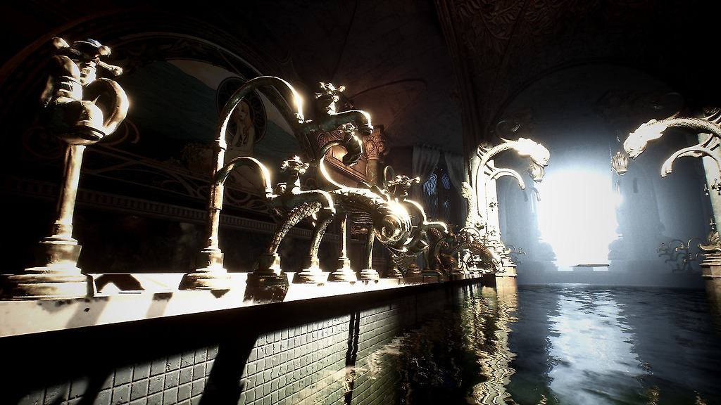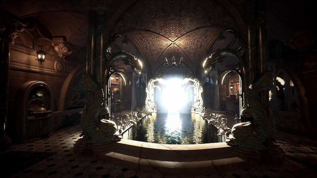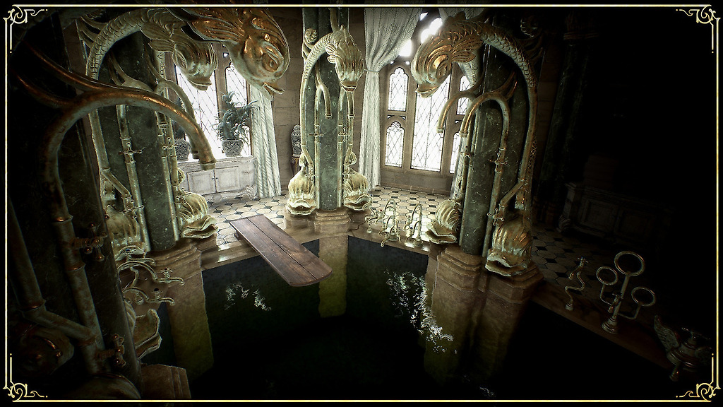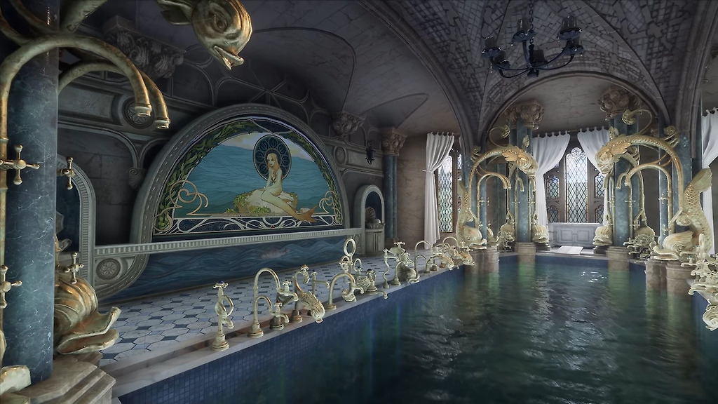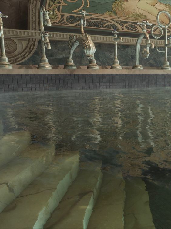 수영장 가장자리를 따라 약 백 개의 금빛 수도꼭지가 있었는데,