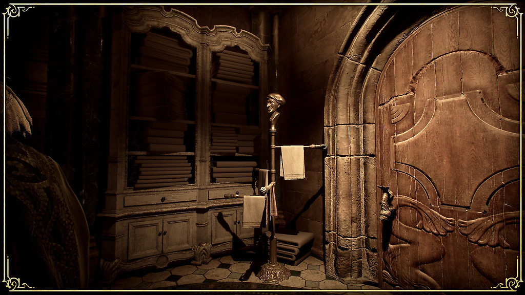 한쪽 구석에는 푹신한 흰 수건 더미가 쌓여 있었으며,