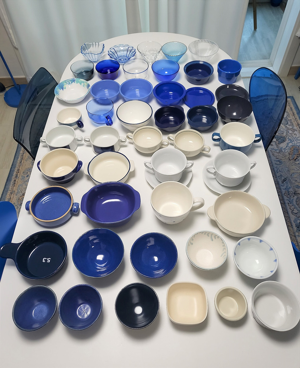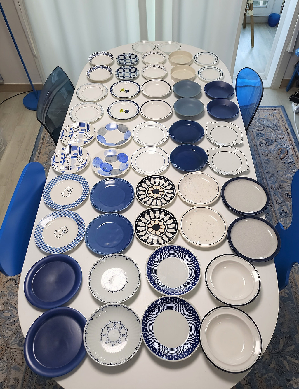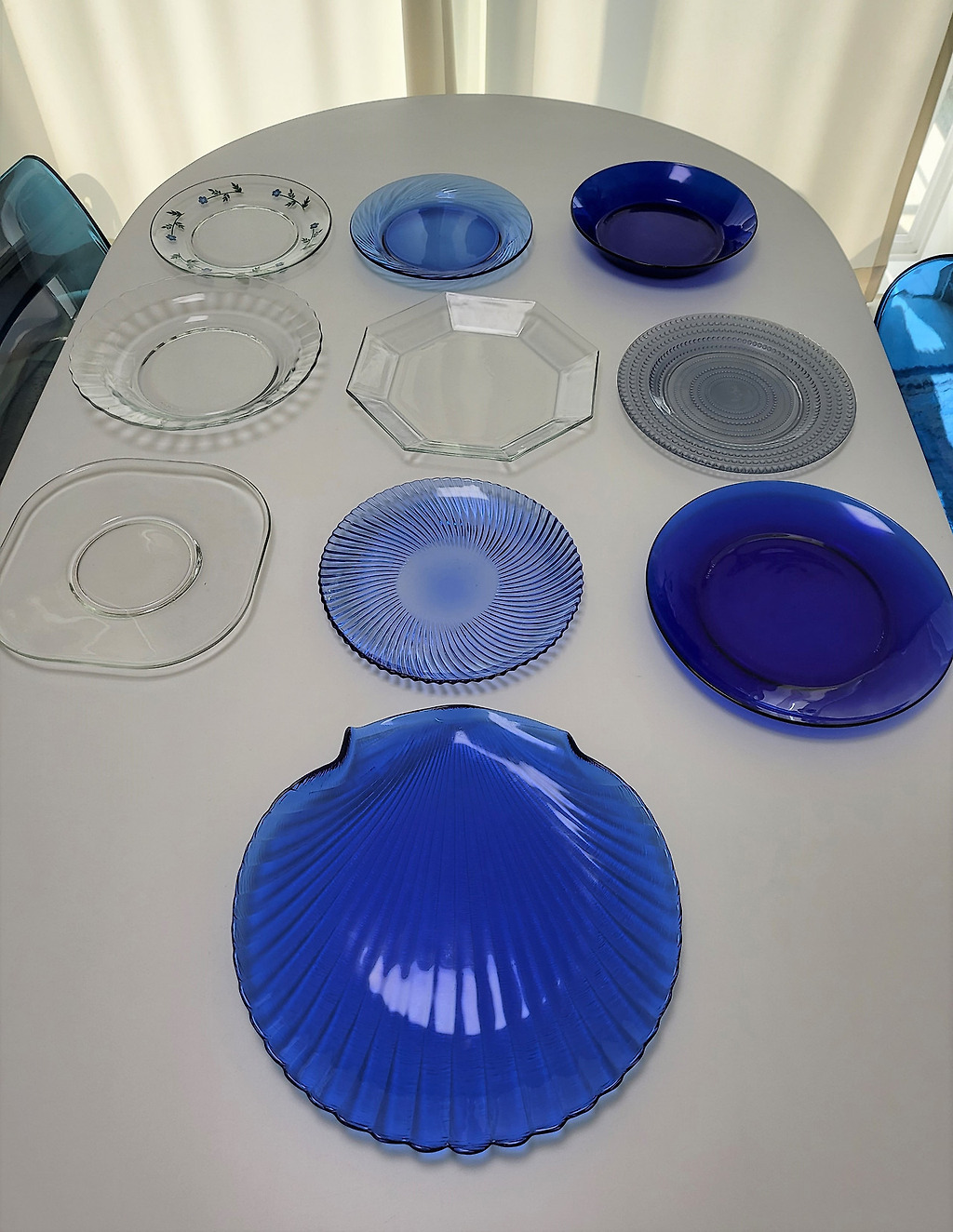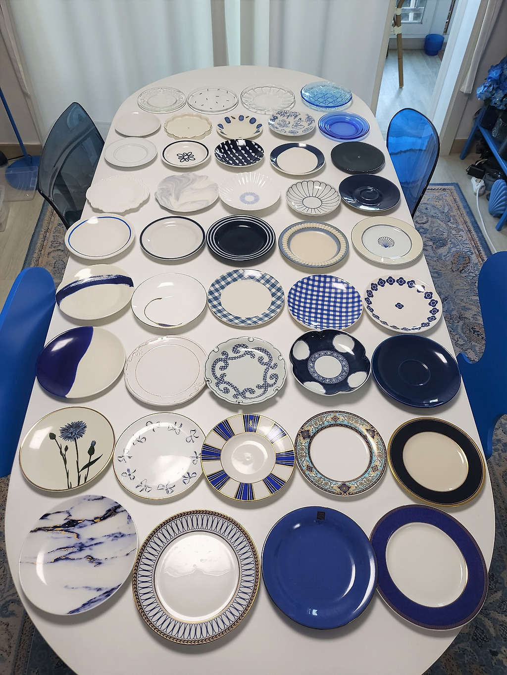 맨 위에 세개는 수납에서 밀려난 굽있는 블루 대접시