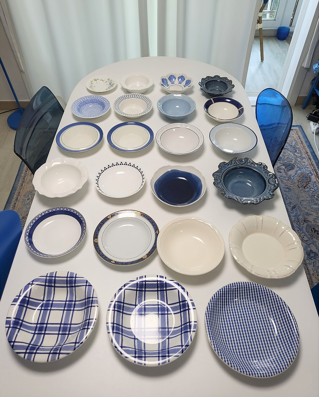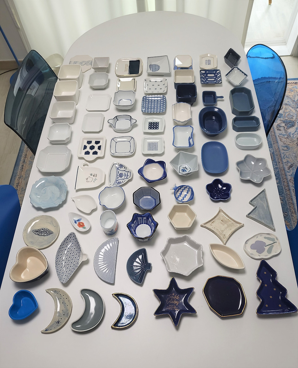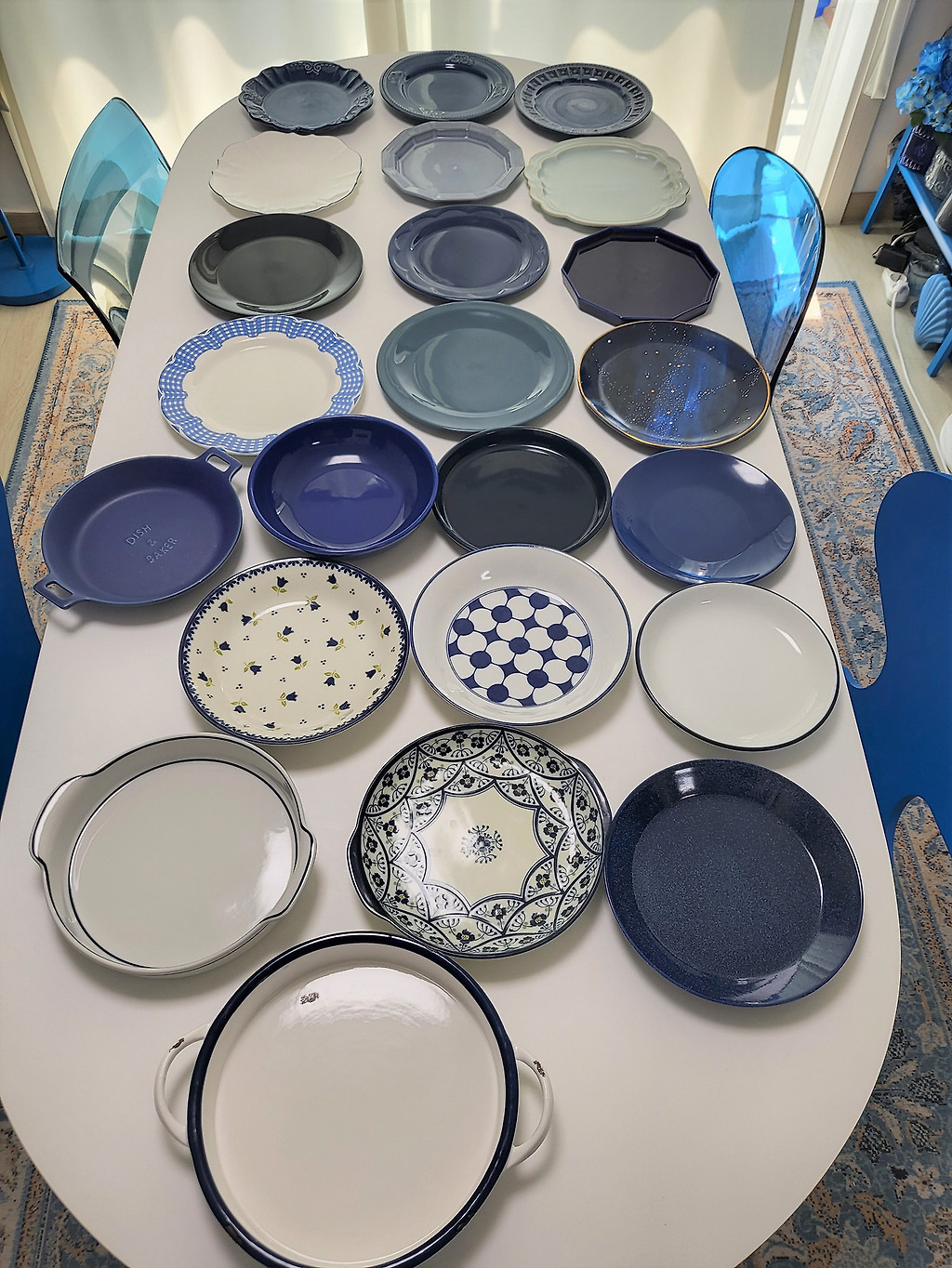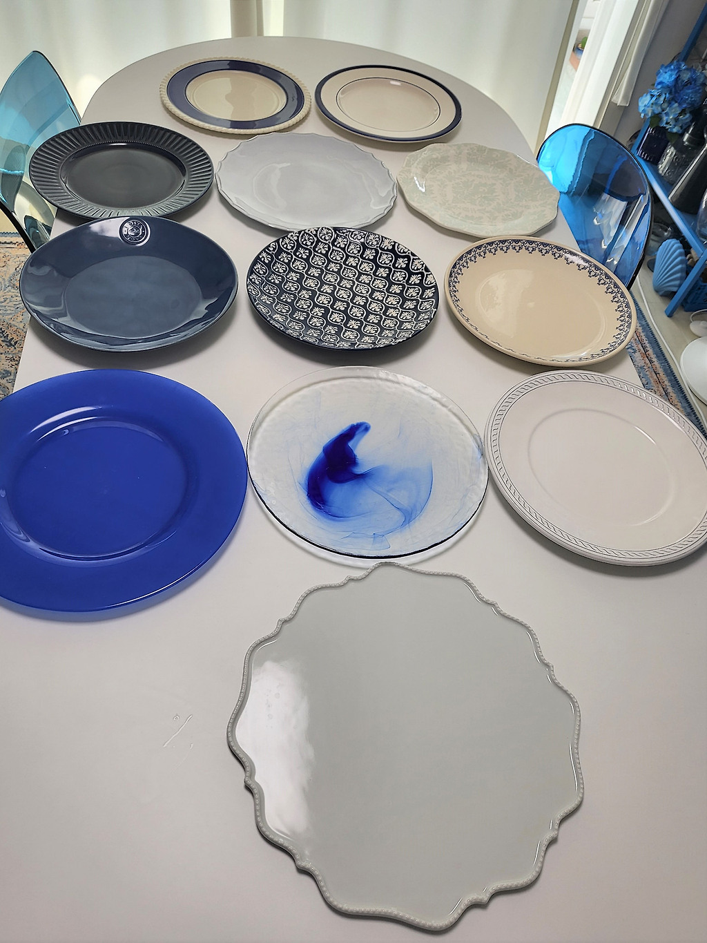 맨 위에 세개는 수납에서 밀려난 굽있는 블루 대접시