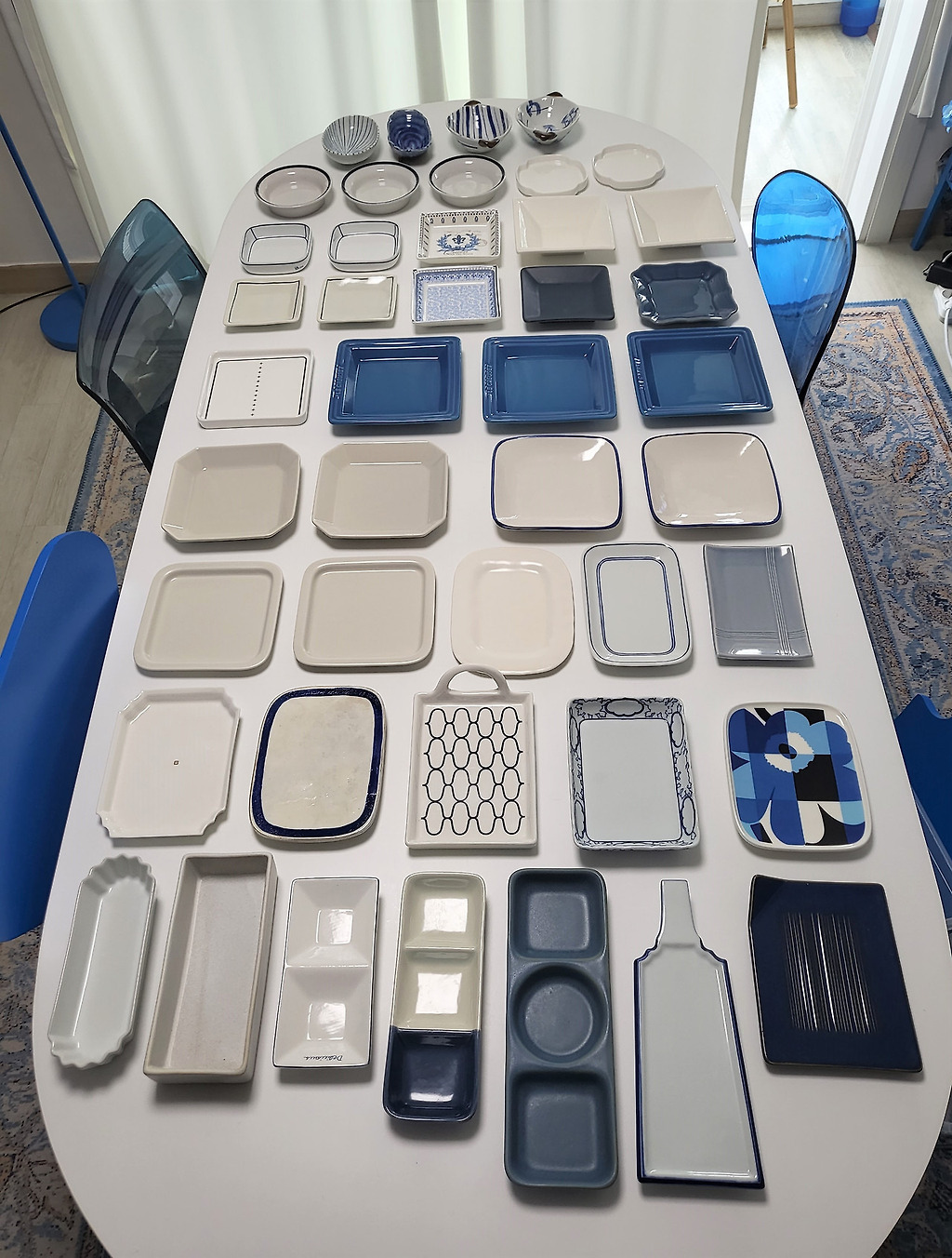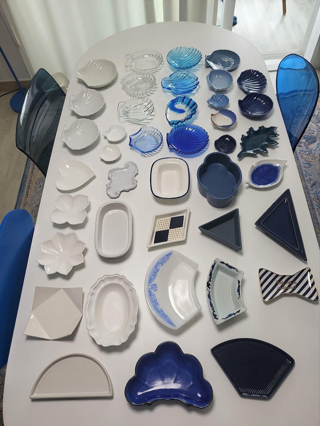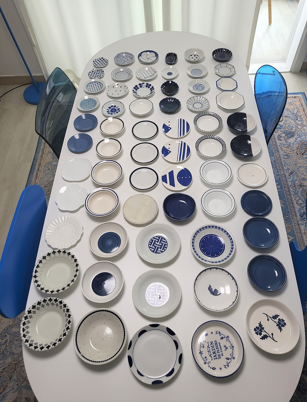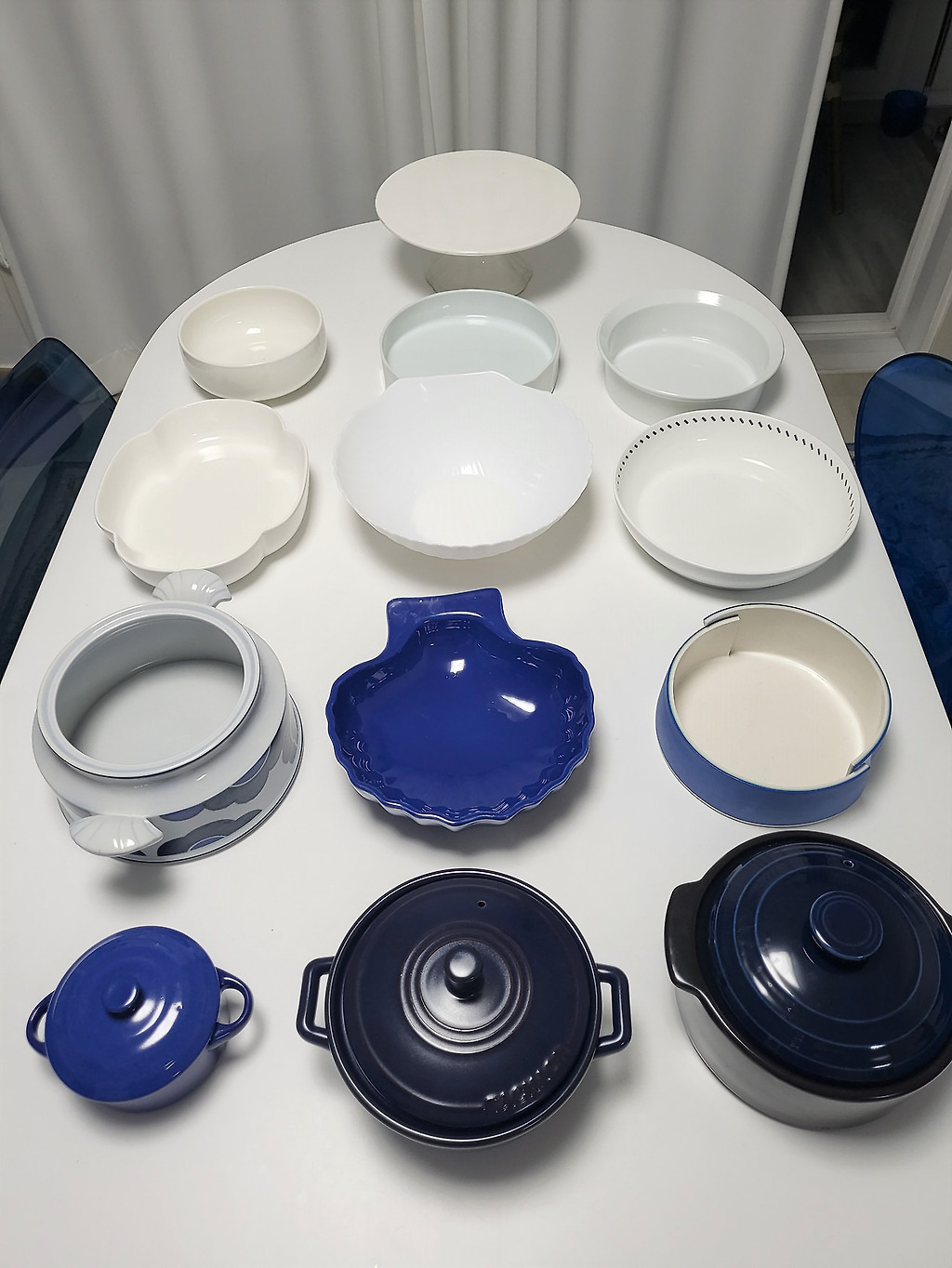 맨 위에 세개는 수납에서 밀려난 굽있는 블루 대접시