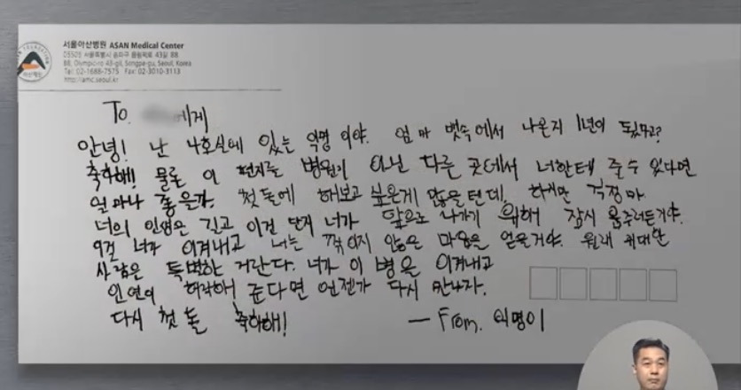 글씨체로 보아 같이 투병하고 있는 어린이로 보이는데.. 마음이 너무 따뜻하고 뭉클해지는 편지네요