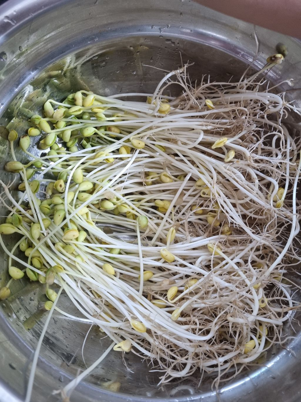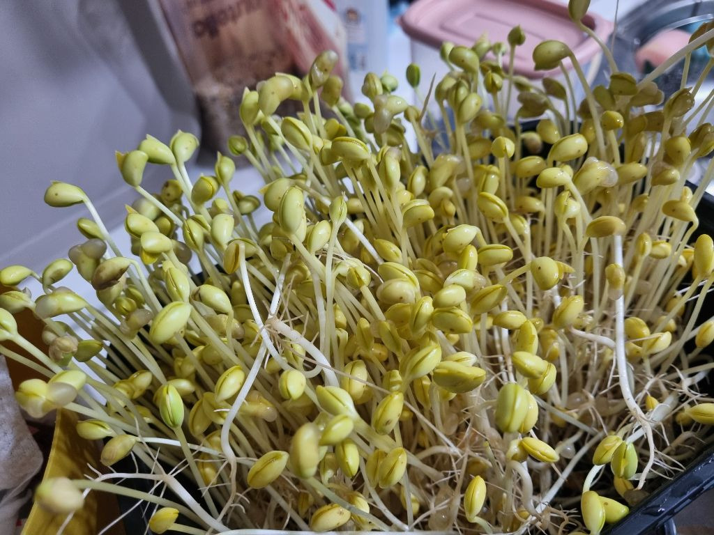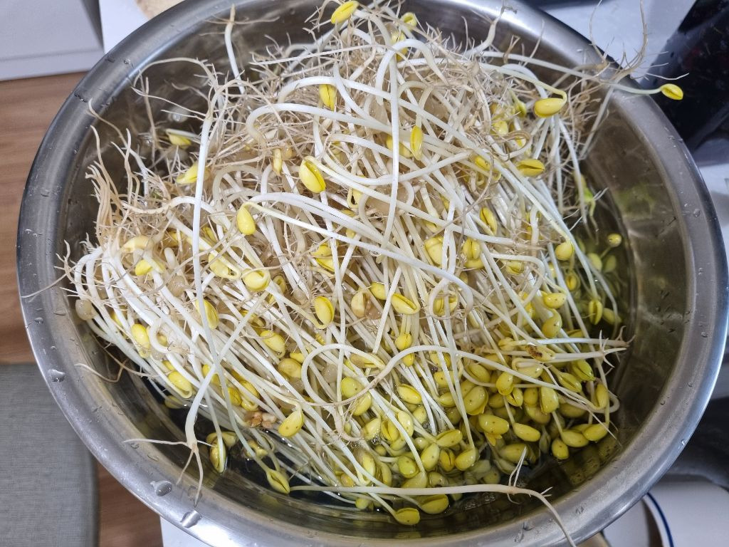 한줌의 콩나물 콩으로 키우기 시작해서 오늘 수확.뿌리가 아주 실하구나...뿌리에 영양분이 많다니 다듬지 않고 두루치기에 넣어보기로 함