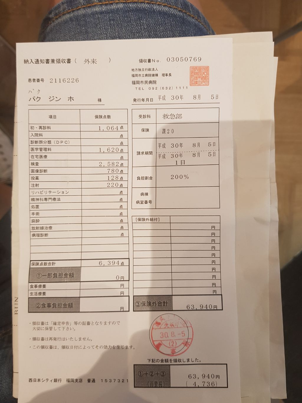 일본에서 119 타고 응급실행... 카드 되는곳으로 가주라고 미리 얘기해야됩니다. 태블릿 pc에 통역사 연결 저와 의사를 번갈아주며 대화하며 통역해줍니다.5% DW 500(수액), 가슴 X-ray, 피검사, 약...금액은??후덜덜 합니다. 여행가서 아프지 마세요..