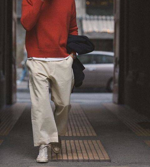 발목 덮는 어두운 쥐색 슬랙스, 살짝 바랜 신발 앞코, 흰 티에 겹쳐입은 검정 스웨터