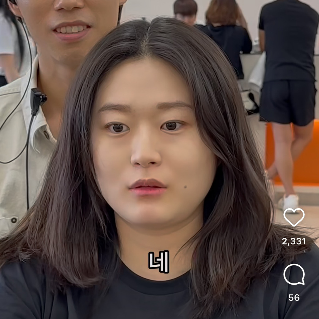 : 머리가 길어서 시선이 아래쪽으로 가고