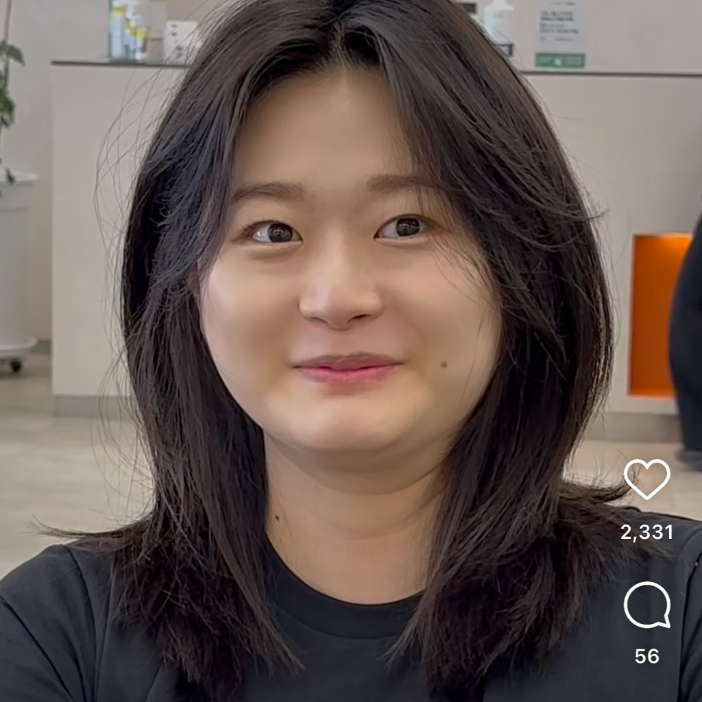 착 가라앉은 긴머리가 볼살을 부각하고 있다