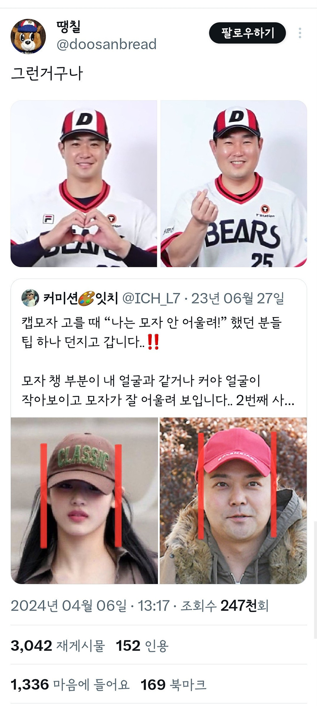 캡모자 고를 때 “나는 모자 안 어울려!” 했던 분들 팁 하나 던지고 갑니다..‼️