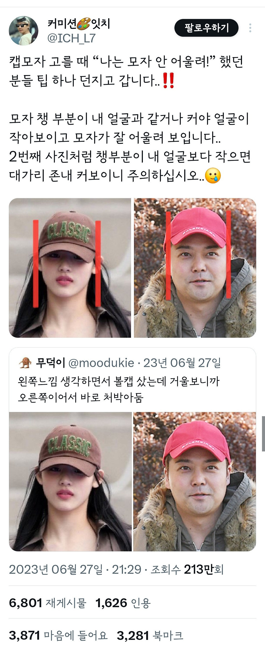 캡모자 고를 때 “나는 모자 안 어울려!” 했던 분들 팁 하나 던지고 갑니다..‼️ 모자 챙 부분이 내 얼굴과 같거나 커야 얼굴이 작아보이고 모자가 잘 어울려 보입니다.. 2번째 사진처럼 챙부분