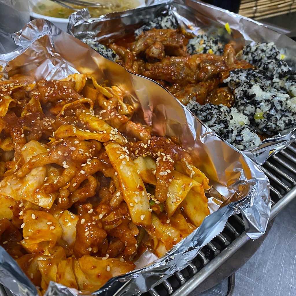 약간 불닭발이나 국물닭발 스타일은 아니고 양배추랑 야채 가득 넣은 제육볶음 느낌 나는데 꽤 매콤해서 주먹밥이랑 같이 먹으면 존맛
