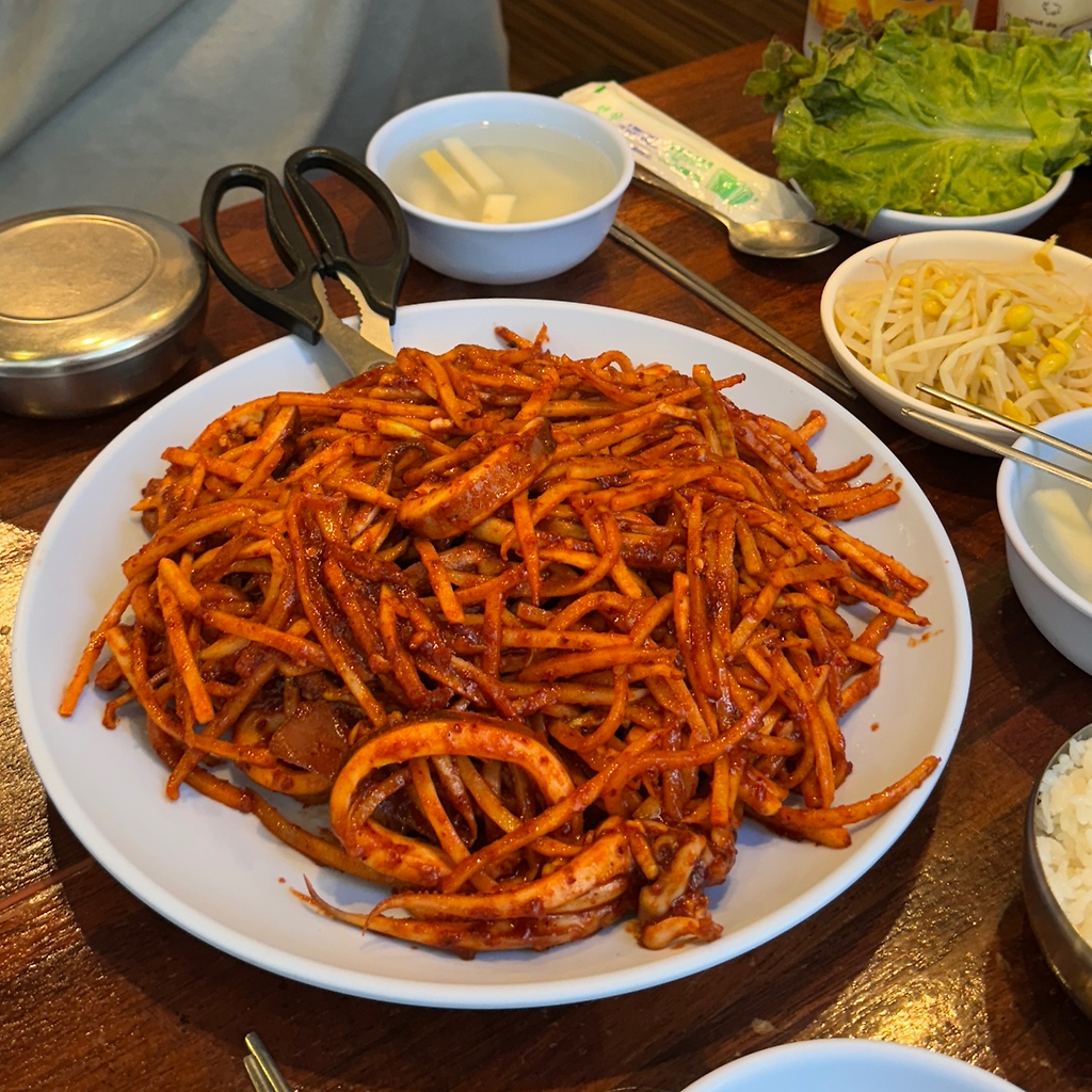 오징어랑 무채가 뻘건 양념에 버무려져있는데 지이인짜 맵고 중독적임