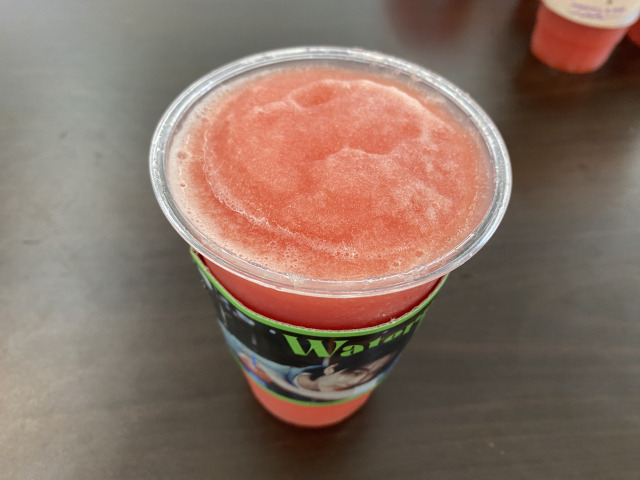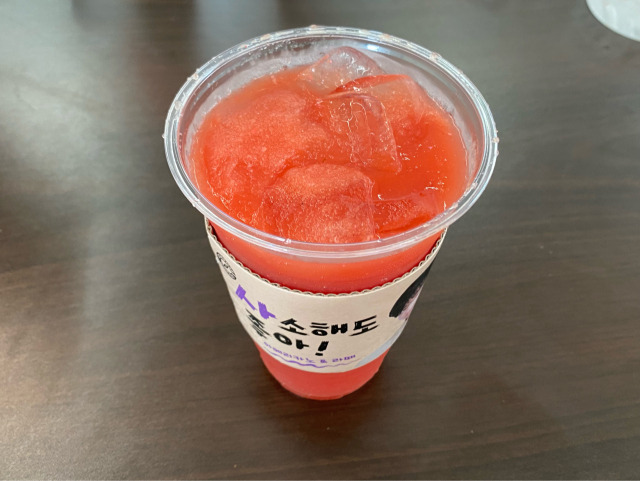 수박 국물에 물 탄 느낌. 맹물 맛이 강하게 느껴짐. 슬러시도 아니고 그냥 수박물. 시원한 맛으로만 먹을 수 있을 것 같은데 단맛도 약해서 다시 사먹을 것 같진 않다.