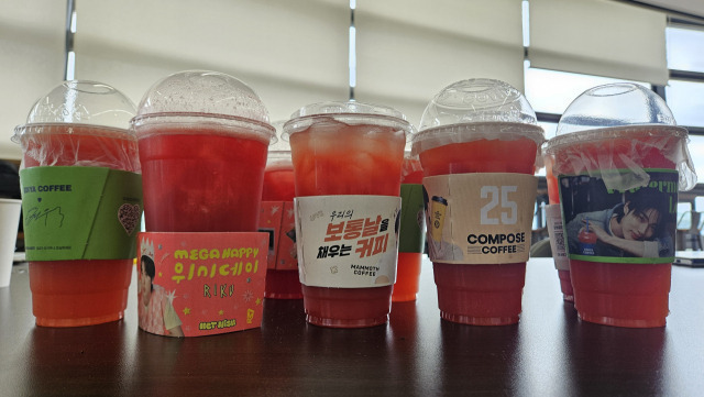 프랜차이즈 카페별 수박주스 4종 비교. 분홍색 컵홀더가 메가커피의 '꿀수박주스'. 김남명 기자