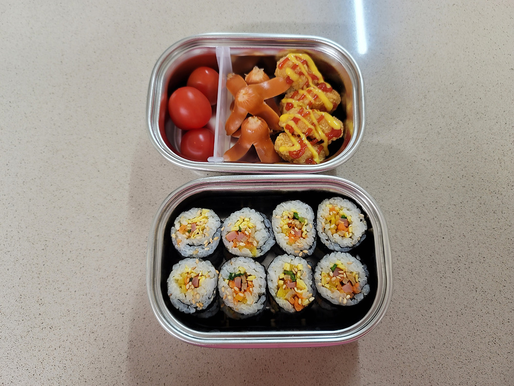 나이 한 살 더 먹었다고 입 크게 벌리길래.조금 더 크게 말았다.도시락 싸서 보내고 집사람이랑 남은 재료 다 말아서 먹었다.그날 우리 집 애기는 삼시세끼 김밥 먹었다.난 밥 하는 게 더 편한데..며칠 전에도 갯벌체험 간대서 주먹밥 싸줬더니.갔다 와서 자기만 김밥 안 싸왔다고 다음에 소풍 갈 때 김밥 싸달라고 하고 저녁으로 김밥 내놓으라고..김 한 장 남아서 싸줬다.잘 먹으니 좋다.