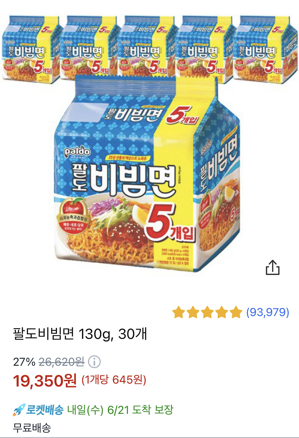 쿠팡에서 팔도비빔면 30개 19,350원 뜨길래 가져와봤어요. 1개당 645원이네요.