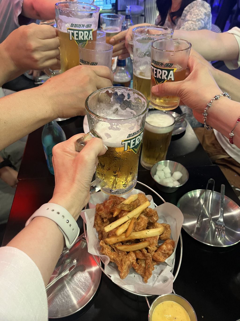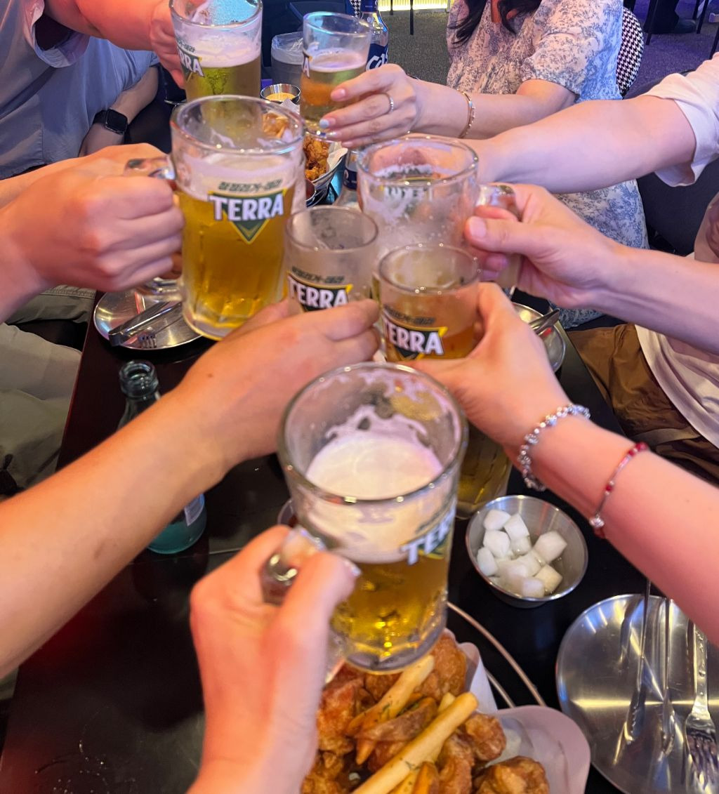 치킨과 맥주로 목을 축이며 서로의 경험을 나누기 시작했습니다.