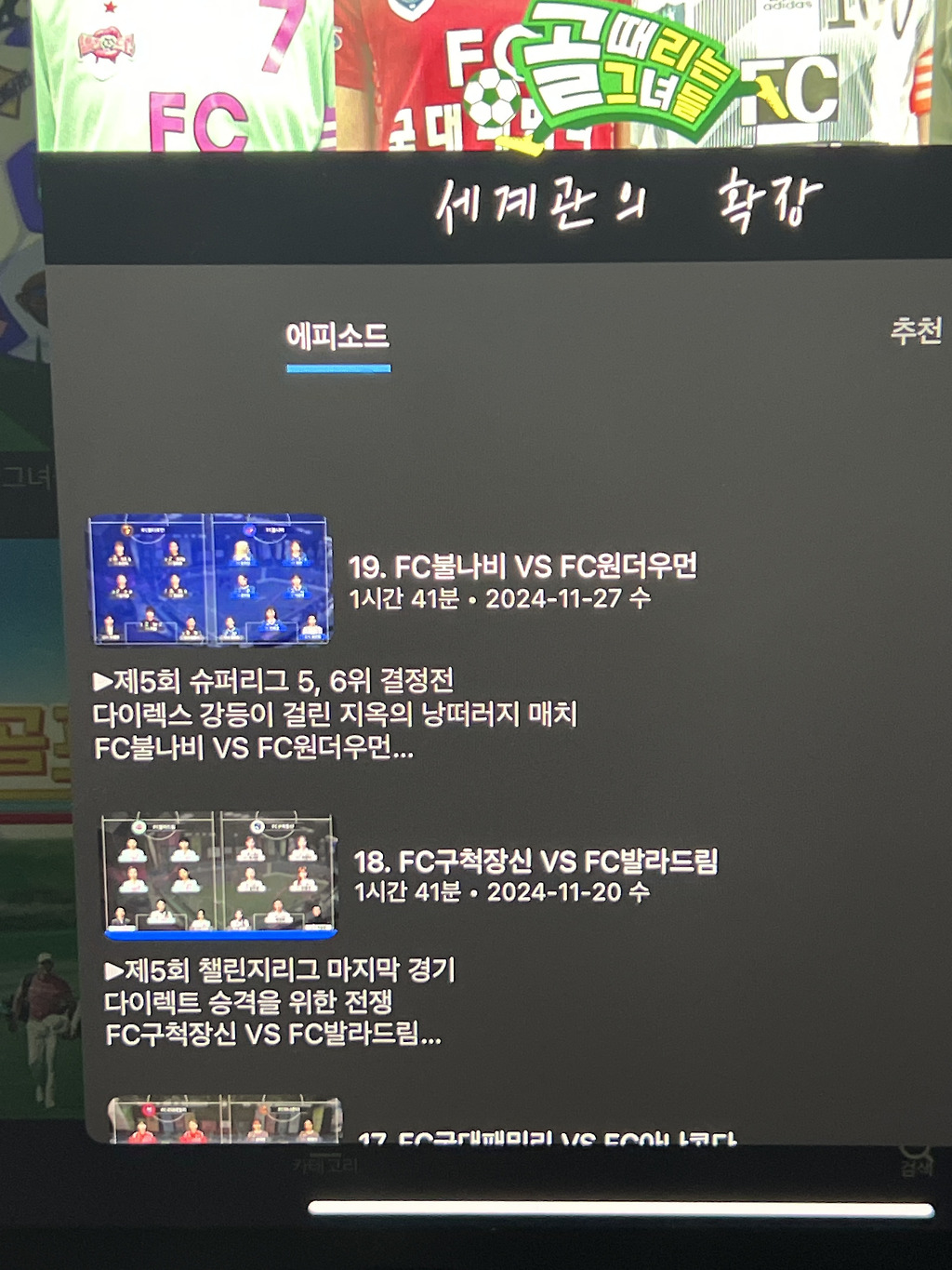 뭔 시즌으로 나눈것도 아니고 골 때리는 그녀들에 1화부터 7월 3일거 올라가있고그 다음거부터 11월거 까진 세계관의 확장에 올라가있고 또 저번거부터 두회차는 골때리는 그녀들에 올라가있네 ㅡㅡ 헛갈리게 왜이러는겨
