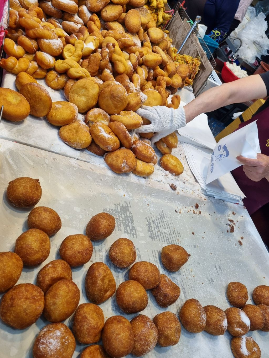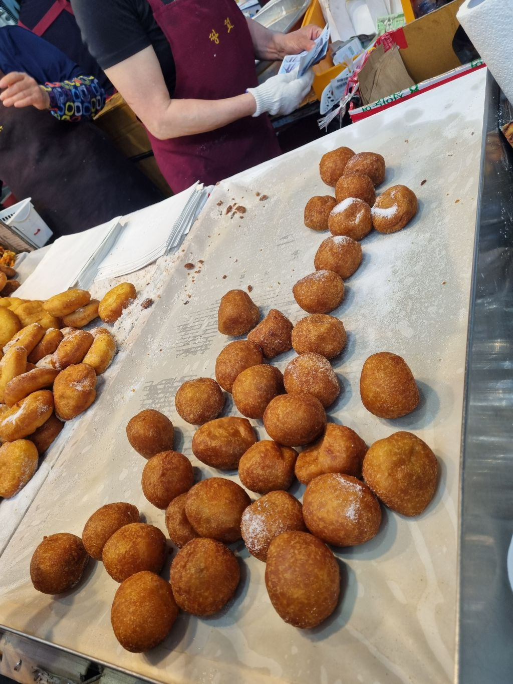판매대 뒤에서 수시로 튀겨주는 갓 나온 도나츠도 무조건 먹어봐야 한다. 예전엔 2개에 천원 이었던것 같은데