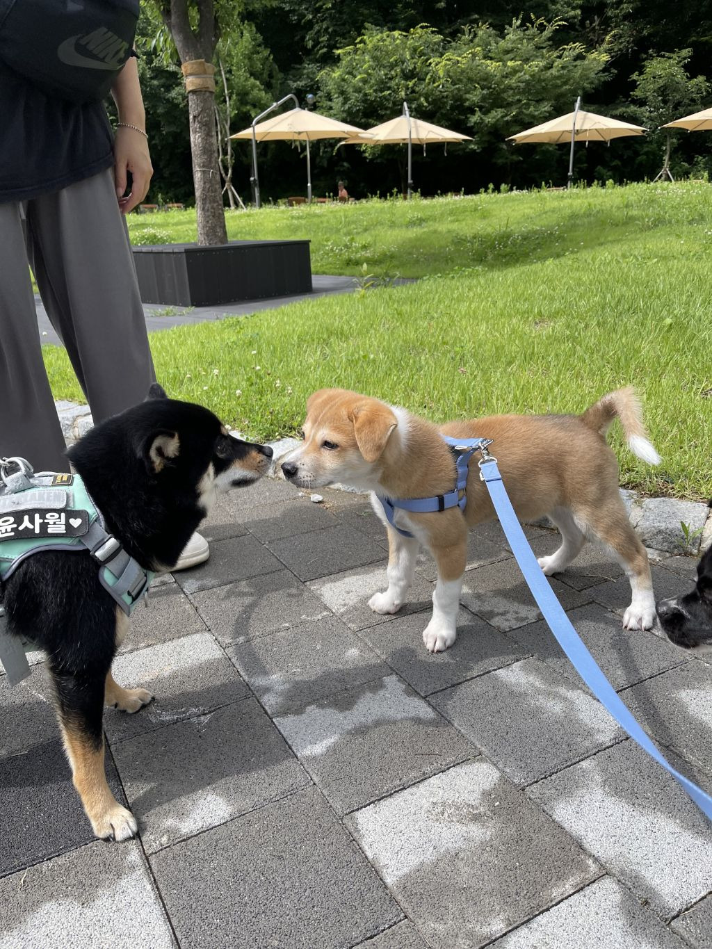 개친구들 다 좋아함, 큰 개에게도 다가가서 코인사 함. 놀때는 신나게 뛰어놀지만 다가갈때는 천천히 인사함.