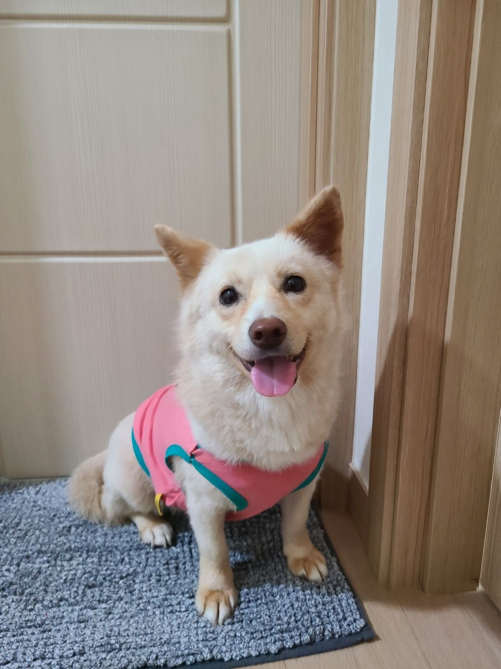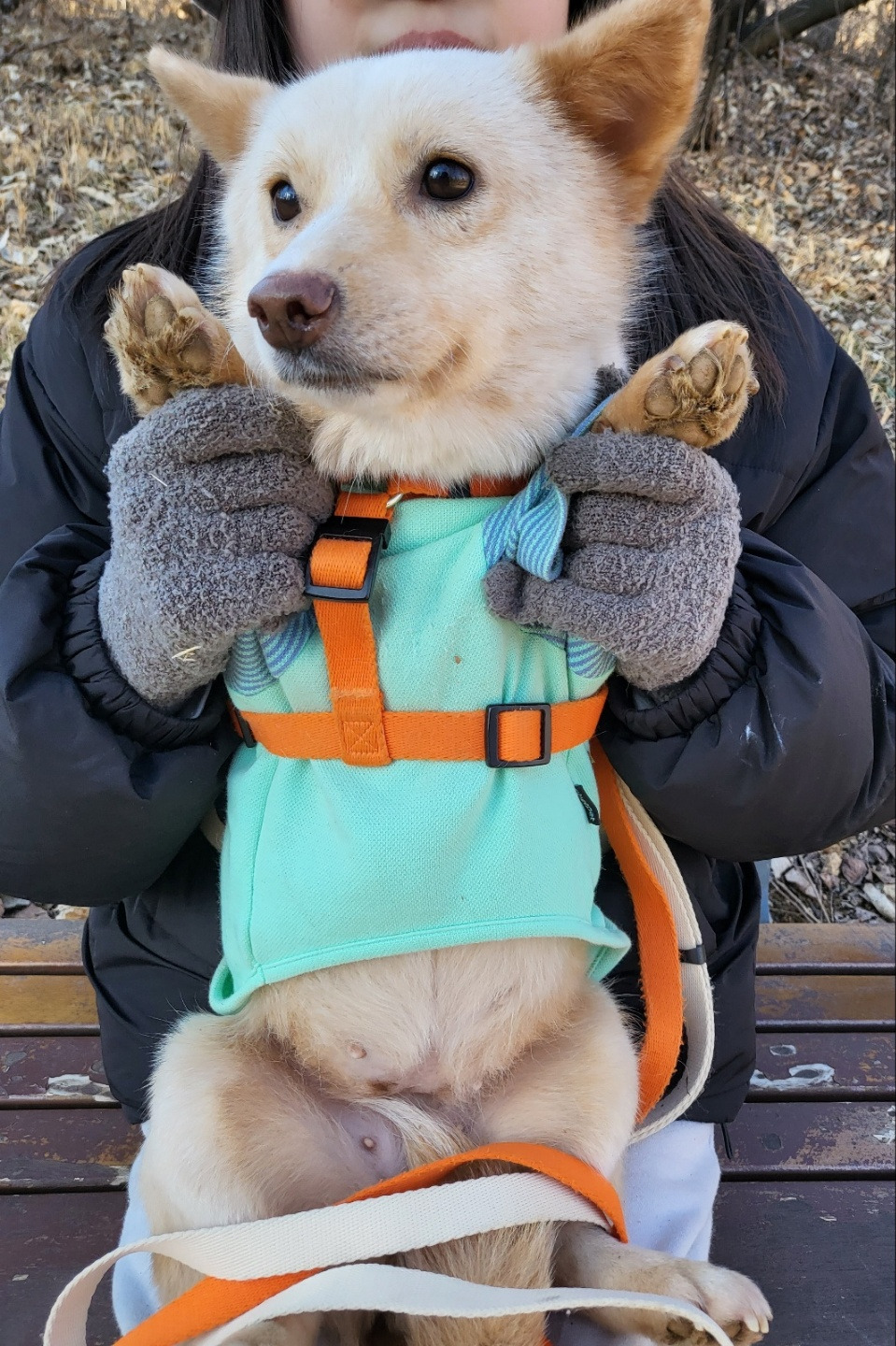 옷 입거나 하네스 보여주면 신나서 현관으로 달려갑니다! 하네스 채우면 신나서 빙글빙글 돌아요