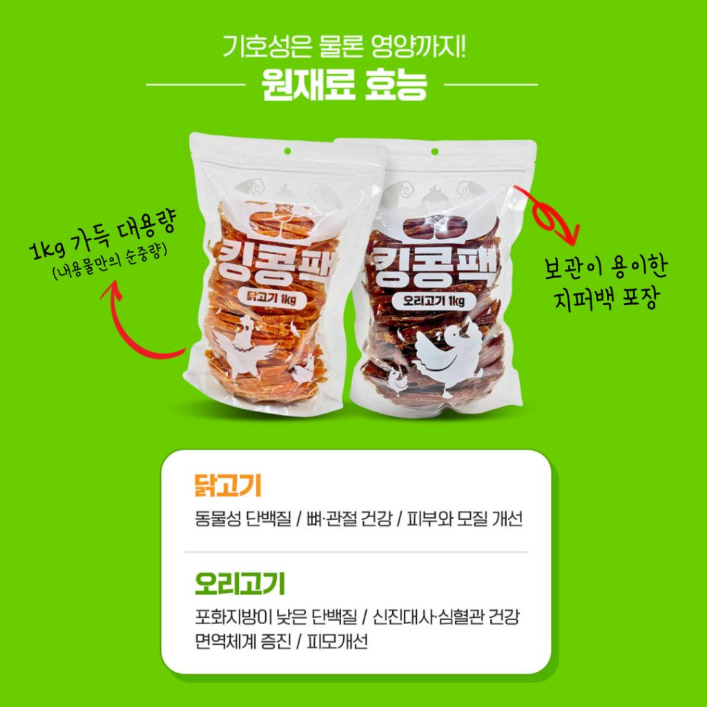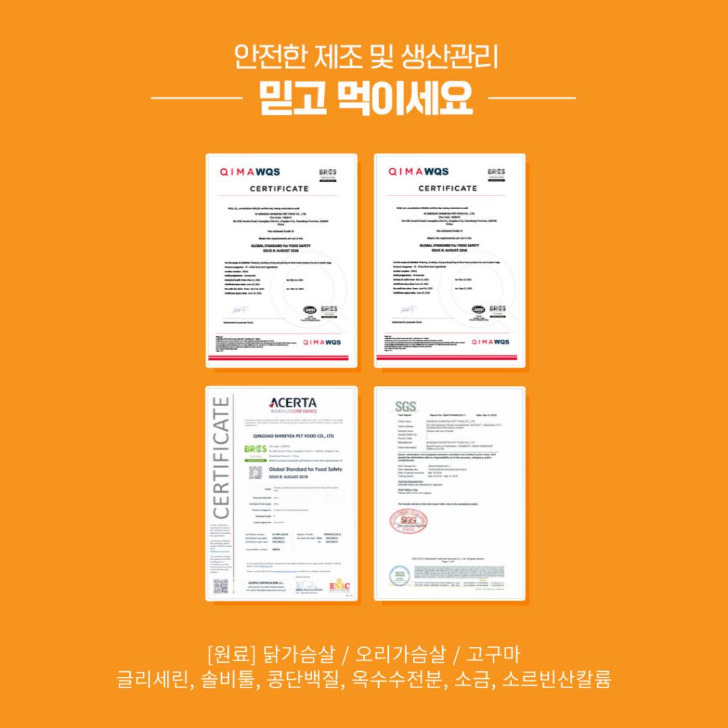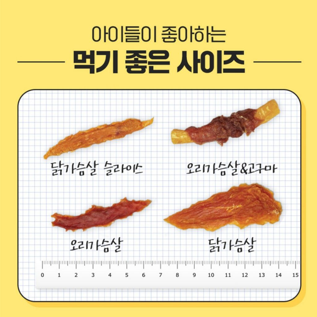 안전하고 꼼꼼하게 제조하여 영양도 만점에 아이들이 먹기 딱 좋은 사이즈로 기호성도 최고인 닭&오리 육포 간식이에요.