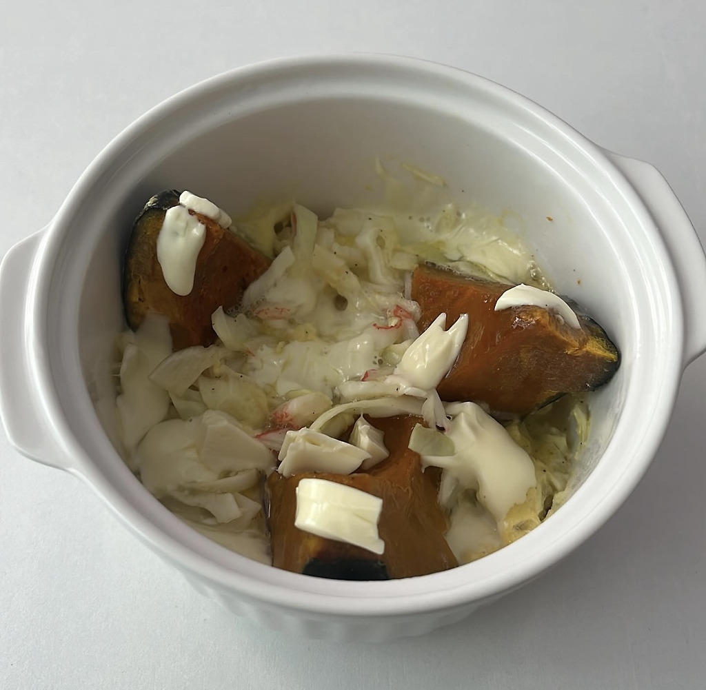 바밤단호박+달걀1+물+양배추크래미1개 치즈 한장에 전자레인지 3분