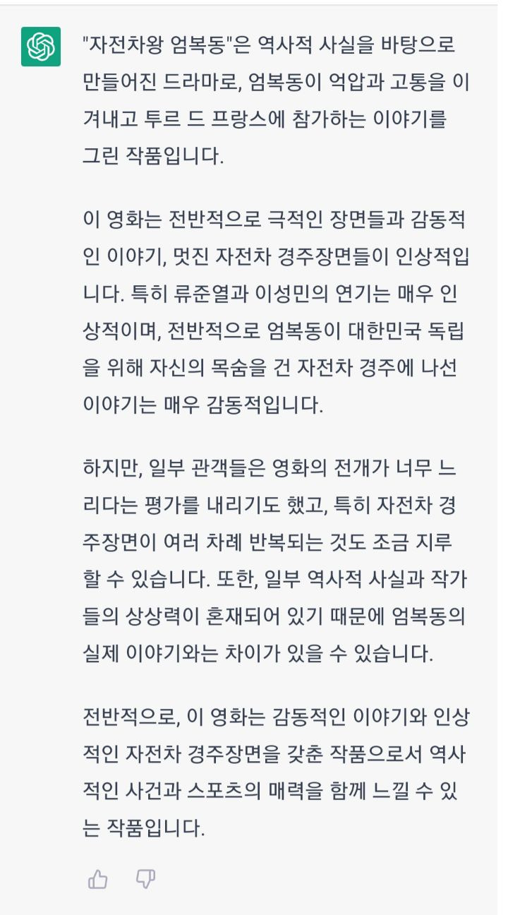 영화 <자전차왕 엄복동> 극찬하는 Chat GPT