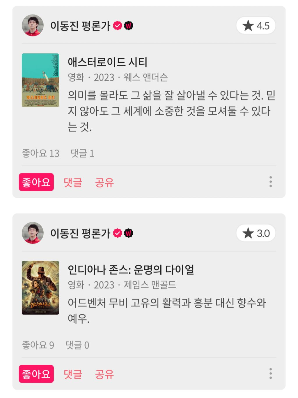 이동진 평론가 애스터로이드 시티, 인디아나 존스 별점 및 한줄평 업뎃