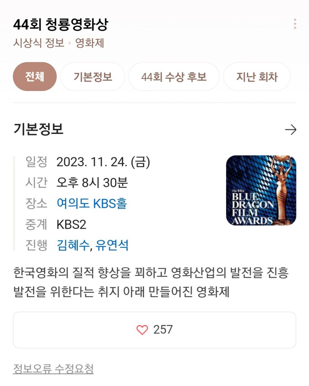 오늘 청룡영화제 하네요