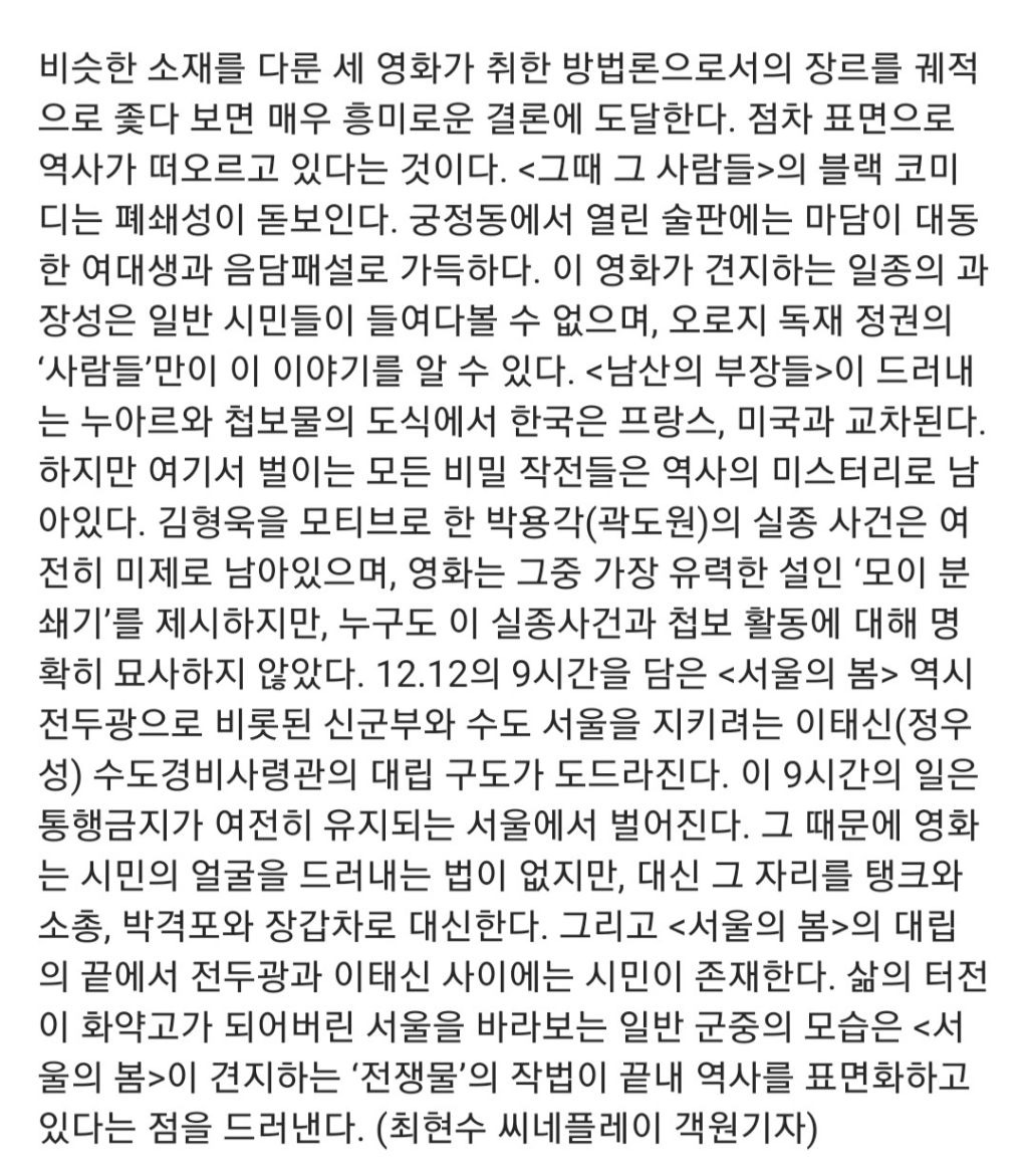 <그때 그 사람들> <남산의 부장들> <서울의 봄> 10.26과 12.12를 그리는 판이한 시선들