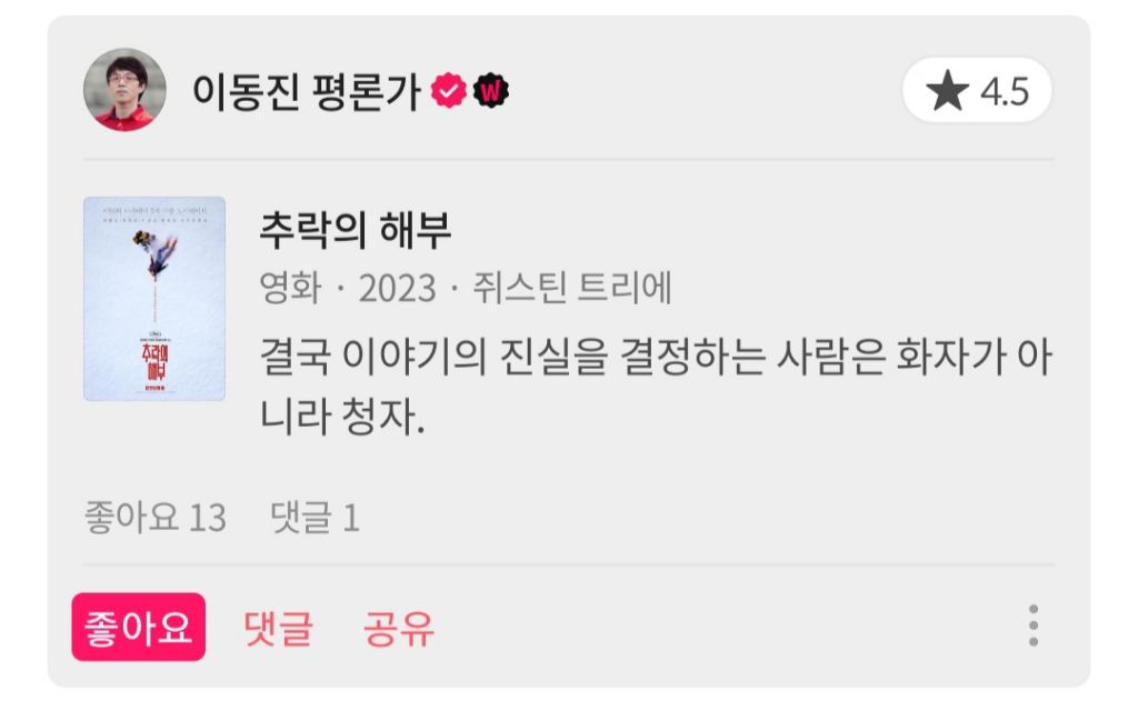 이동진 평론가 <추락의 해부> 별점 및 한줄평