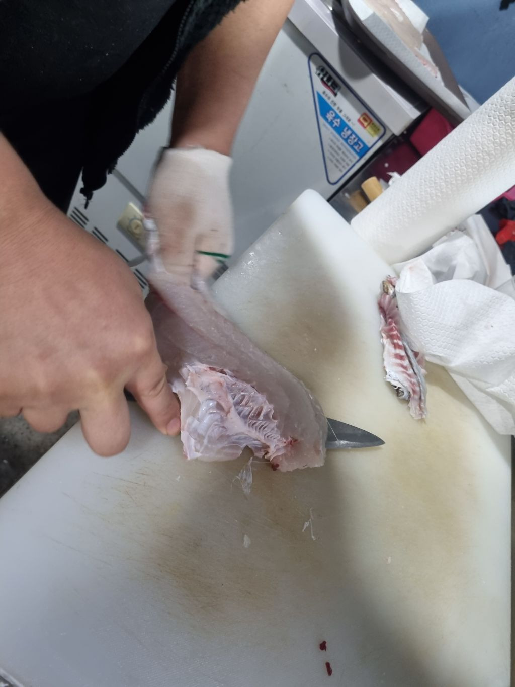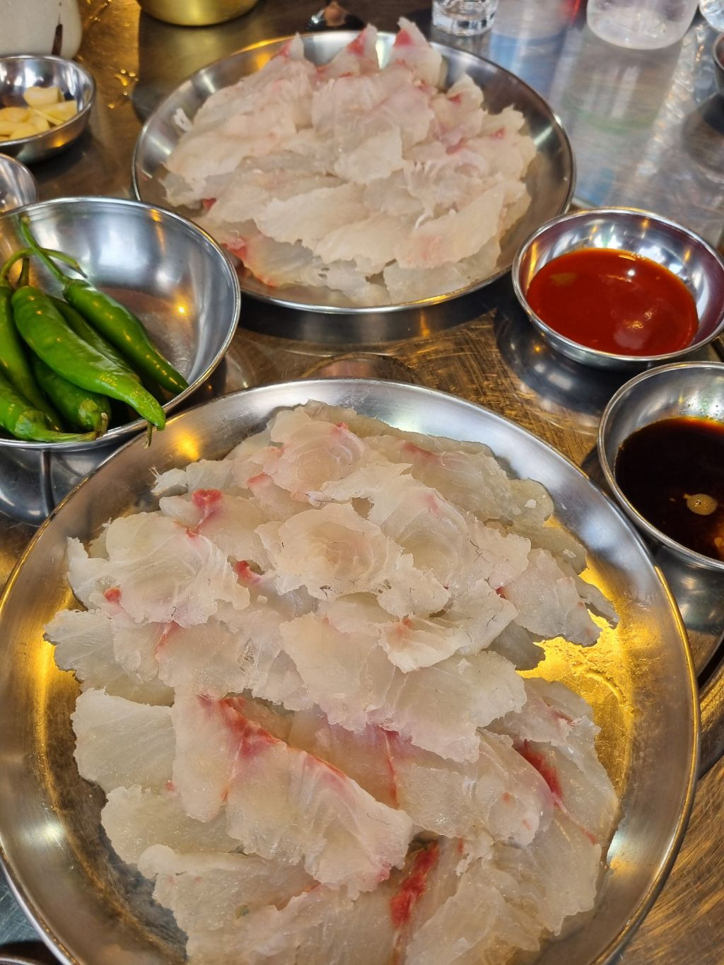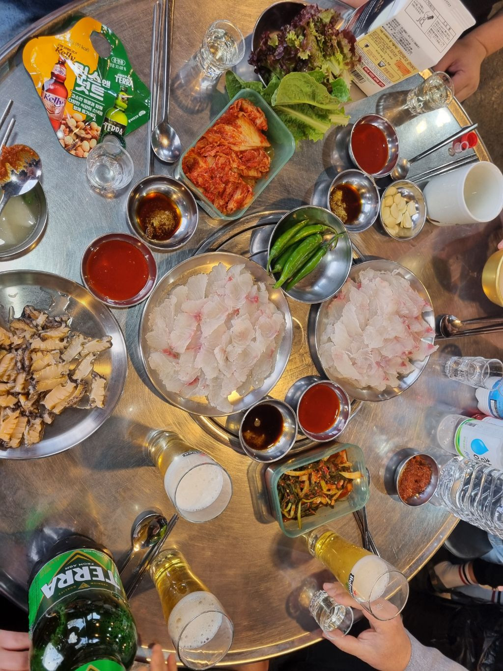 크으!!! 오늘 제주 바당에서 팔딱팔딱 살아있는 참돔 3마리 잡고호텔 조리과 출신 고기집 사장님이 회 얇게 떠주시고,전직 요리강사 친구가 전복 손질하고 버터구이와 회로 2접시로 내놓고텃밭에서 따온 싱싱한 로메인상추와 고추사장님 시어머니표 파김치와 묵은지이거야 말로 최고의 술안주 아니겠습니꽈!!맥주 소주 막걸리 사케 취향것 맘껏 먹고 마시고 마무리로 살과 가시 듬뿍 넣은 참돔지리탕으로 마무리👍 👍 👍