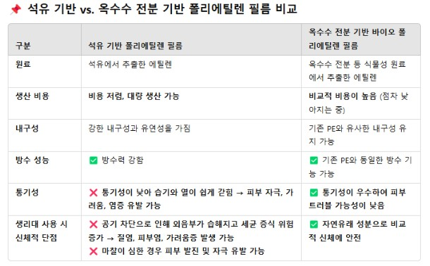 ✅ 석유 기반 폴리에틸렌 필름은 비용이 저렴하고 내구성이 강하지만, 통기성이 낮아 피부 자극 및 세균 번식 위험이 있음.