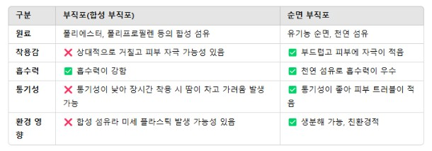 👉 브랜드마다 ‘순면’, ‘유기농’ 등의 키워드를 강조하지만, 실제로는 부직포(합성 섬유)를 사용하는 경우가 많음!