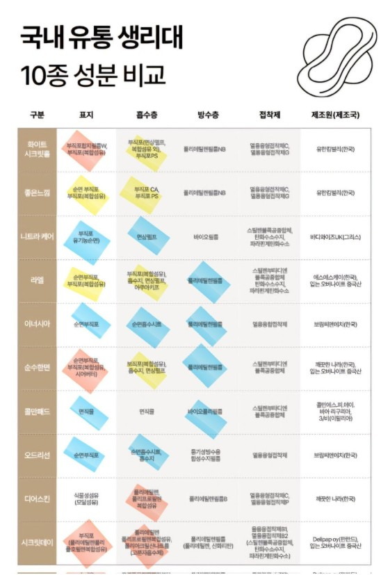 성분표 상 안전한 생리대 - 나트라케어, 이너시아, 오드리선 생리대