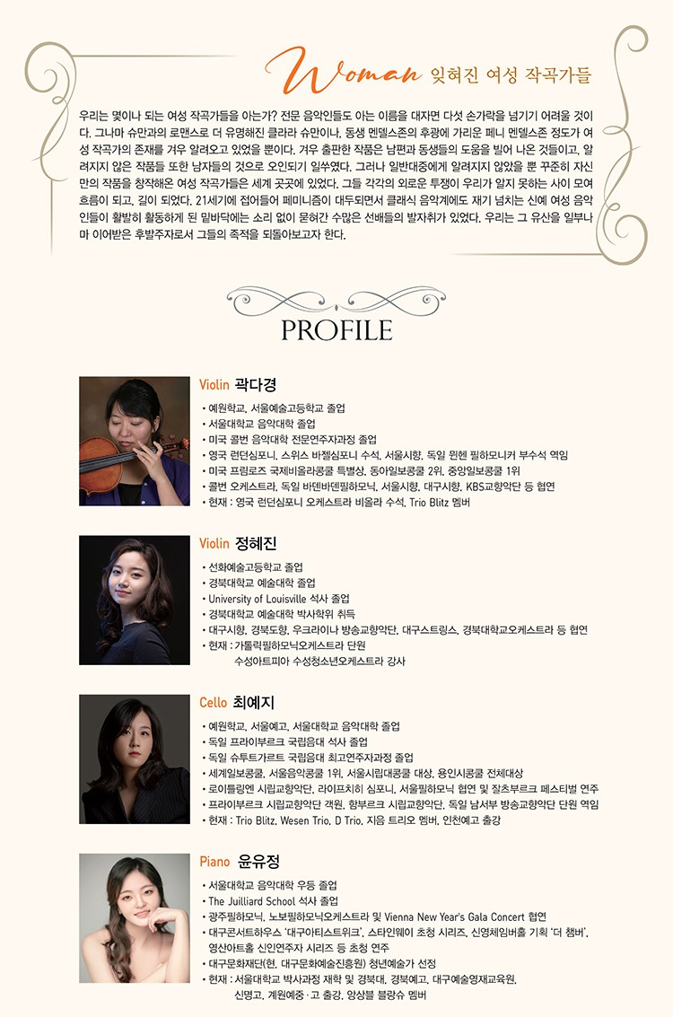 #대구연극 #대구뮤지컬 #대구공연 #대구문화 #대구클래식 #대구공연정보 #한영아트센터 #잊혀진여성작곡가들 #바이올리니스트_곽다경 #바이올리니스트_정혜전 #첼리스트_최예지 #피아니스트_윤유정