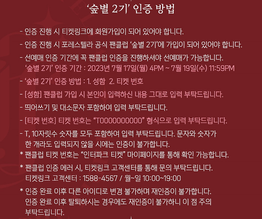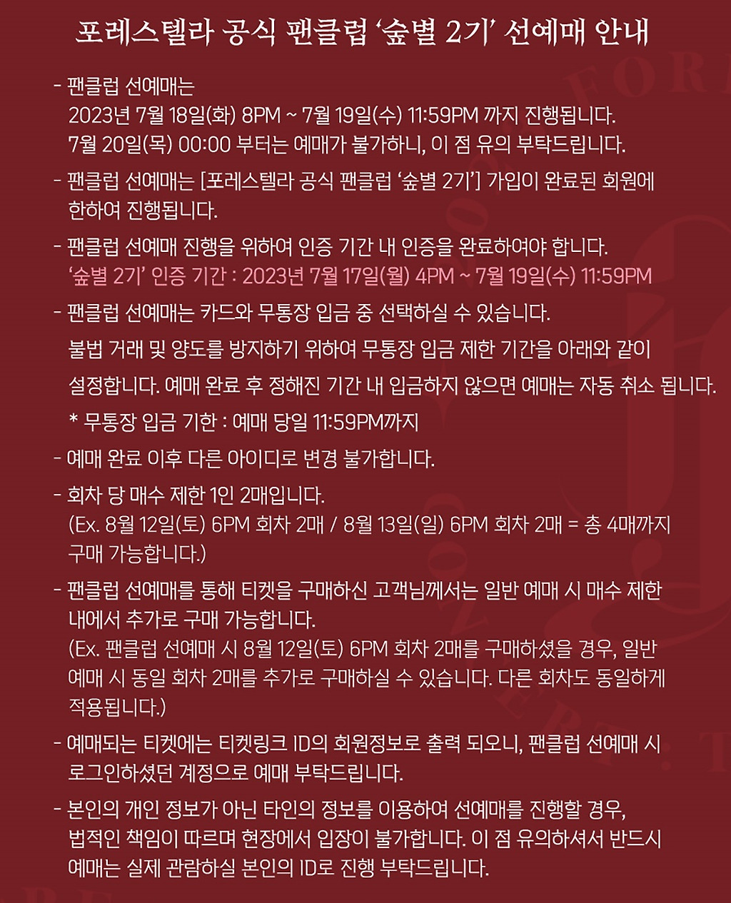 * 숲별2기 선예매 티켓오픈 : 2023년 07월 18일(화) 20시 ~ 07월 19일(수) 23시 59분