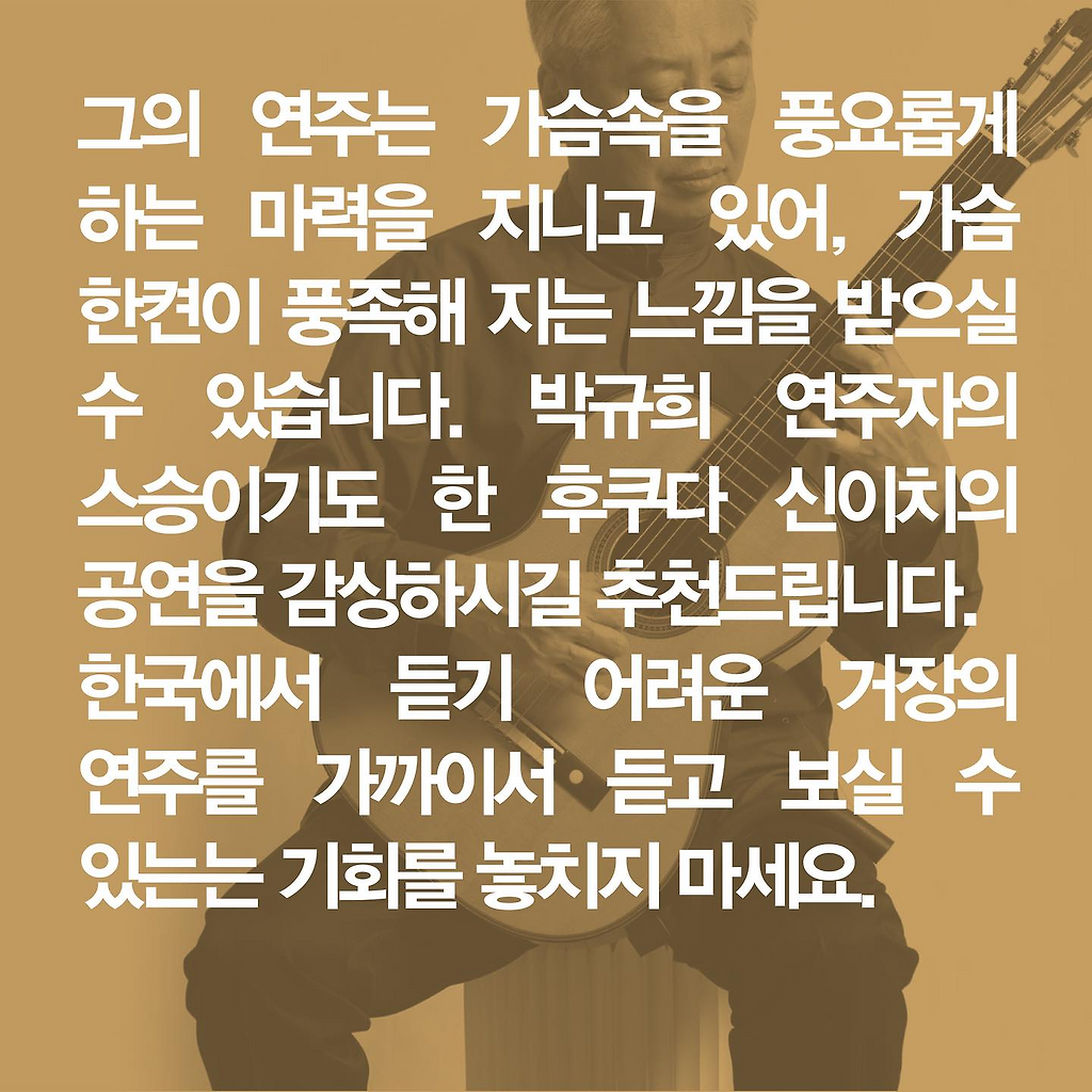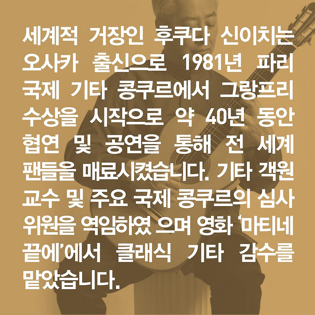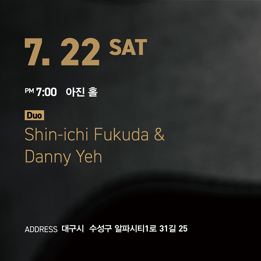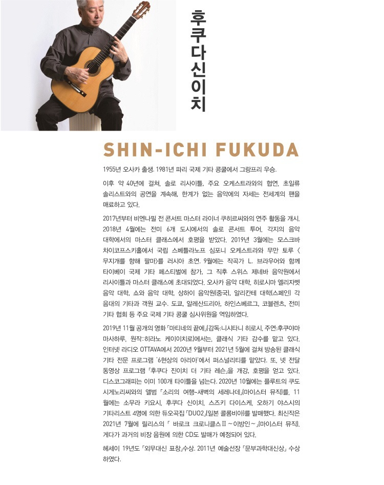 현란한 스피드와 변화의 무쌍함, 화려한 기교가 매력적인 최고 연주자 후쿠다 신이치님과 대만을 대표하는 기타리스트 예등민님의 이번 공연에 꼭 자리하시기 바랍니다.