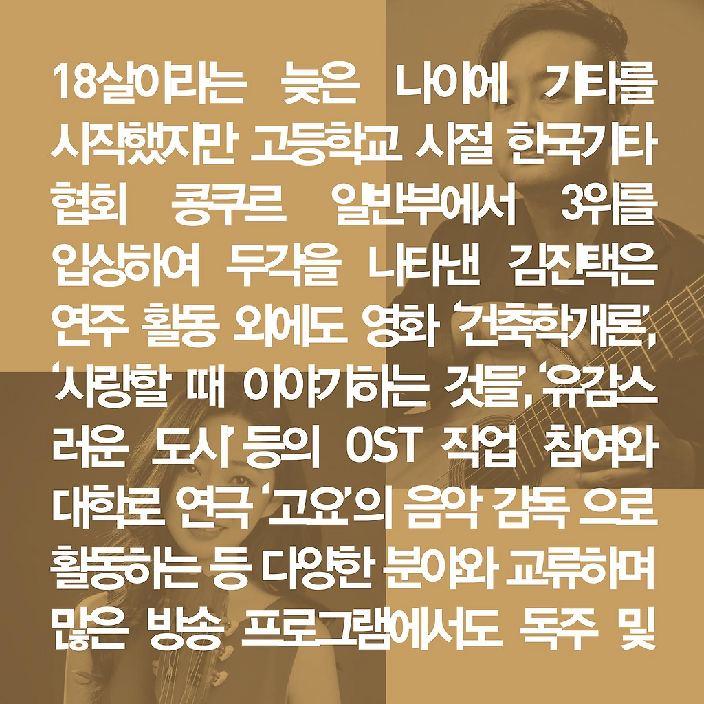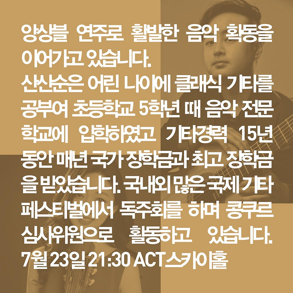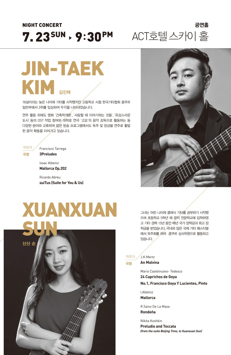 서정적이고 아름다운 소리로 따뜻한 감성속에서도 절제미와 공간감을 표현하는 한국의 김진택님과 여러 매체와 많은 관객들에게 많은 환호와 긍정적인 평가를 받고 있는 중국의 산산 순님의 합동 기타 공연에 여러분들을 초대합니다.