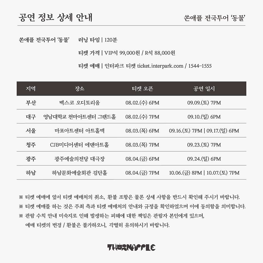 쏜애플 전국투어 ‘동물’ - 대구 - 인터파크 (interpark.com)