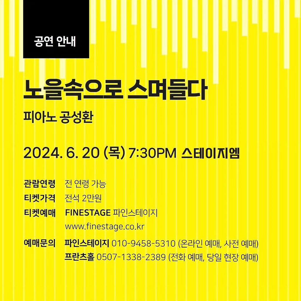 이번 연주는 마치 감성을 담은 시를 펼쳐 읽는 듯한 자작곡들을 감상할 수 있습니다. 피아니스트 공성환의 손끝에서 음악이 탄생하면, 공연장 안은 마치 시적인 공간으로 변합니다.