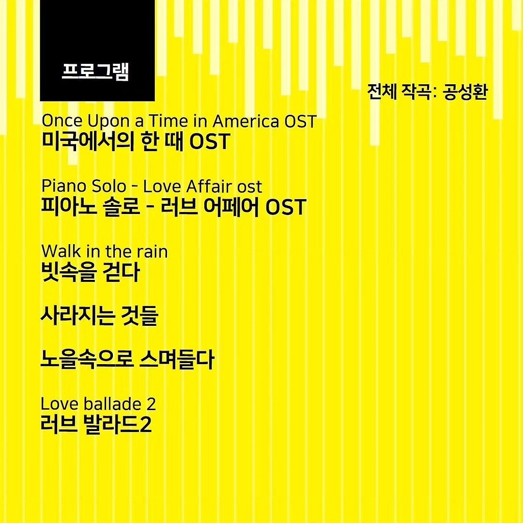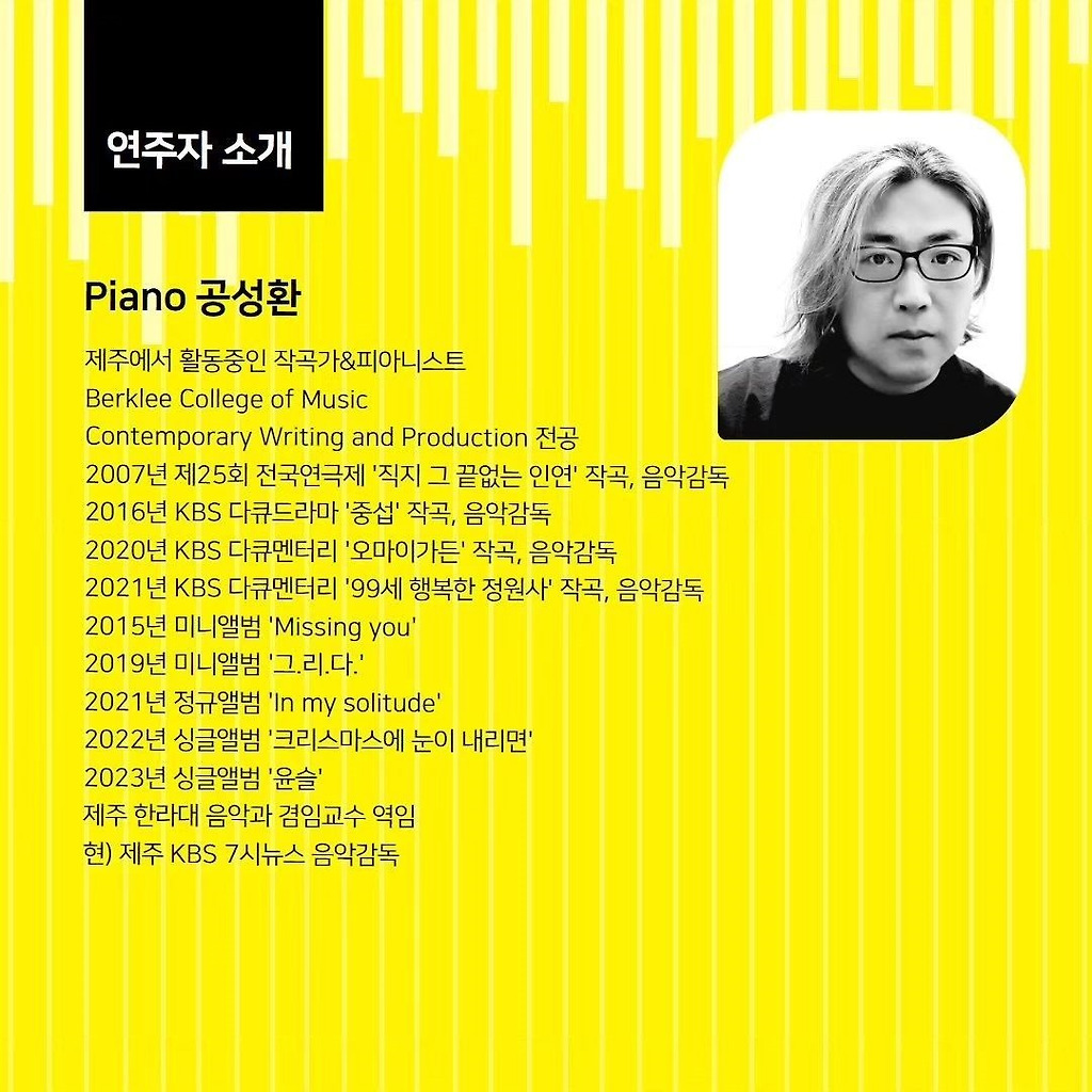 이번 연주는 마치 감성을 담은 시를 펼쳐 읽는 듯한 자작곡들을 감상할 수 있습니다. 피아니스트 공성환의 손끝에서 음악이 탄생하면, 공연장 안은 마치 시적인 공간으로 변합니다.