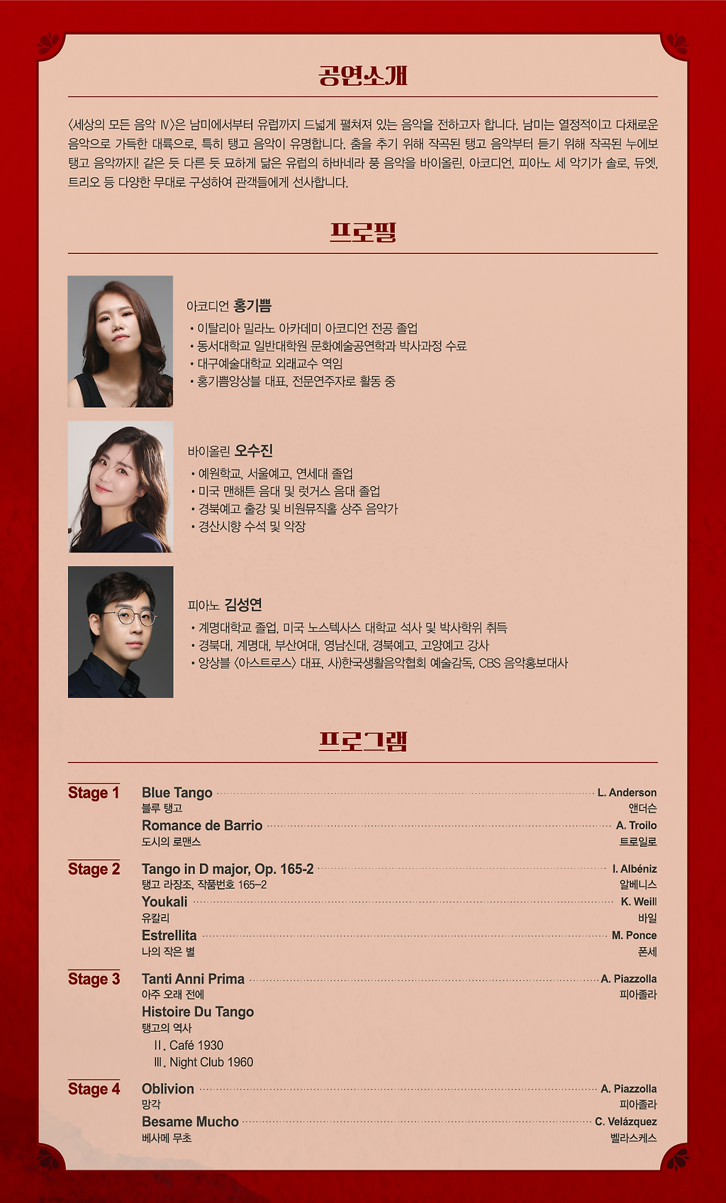 바이올린, 아코디언, 피아노 세 악기가 다채로운 무대를 선사합니다.