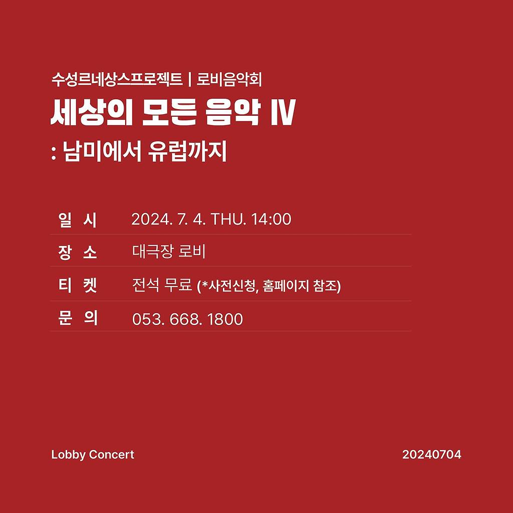 #대구연극 #대구뮤지컬 #대구공연 #대구문화 #대구무료공연 #대구공연정보 #수성아트피아 #로비음악회 #세상의모든음악 #남미에서유럽까지