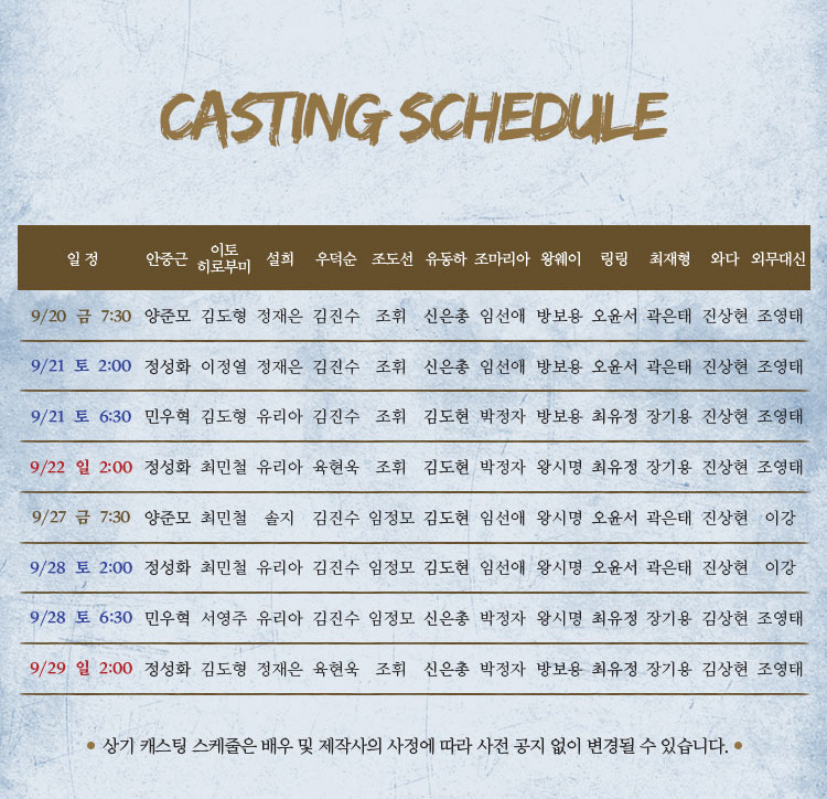 금요일 19시 30분 / 토요일 14시, 18시 30분 / 일요일 14시