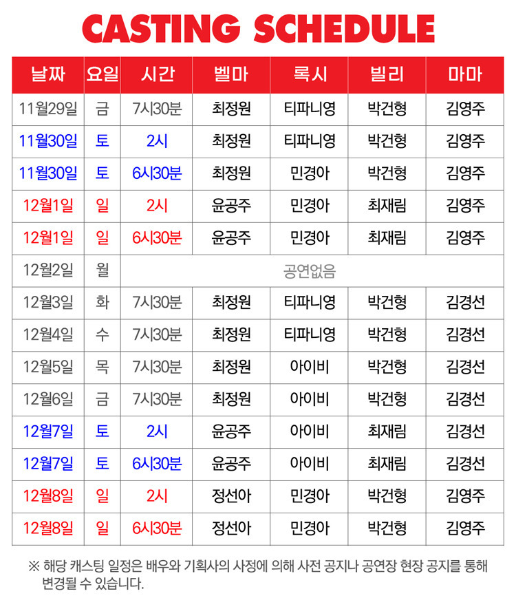 (화,수,목,금) 19:30 / (토,일) 14:00, 18:30 / 월요일 공연 없슴